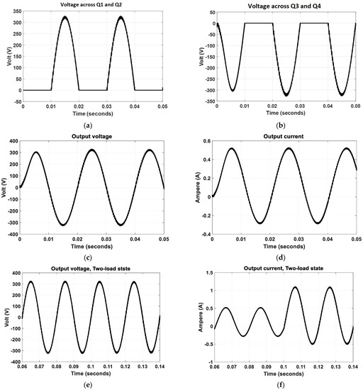 Figure 22c,d, and the voltage across the switches Q1-Q2 and Q3-Q4 are reported. As expected, rectified voltage waves with maximum and minimum amplitude of the output voltage and 50 Hz frequency are obtained for these pairs of transistors. These voltages are considered as the input voltage for the full bridge inverter block, and finally a fully sinusoidal voltage is obtained for the load. These voltage waves are presented in
