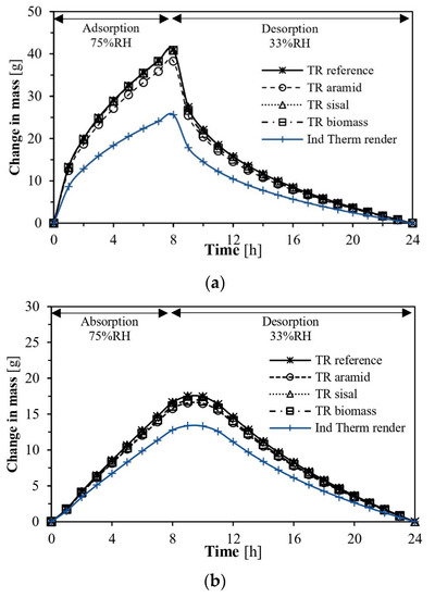 Finally, it was considered the application of a commercially available multi-layered coating system composed of a basecoat (3 mm) and a finishing coat (2.5 mm), as presented in [25]. Figure 8c shows that the maximum change in mass due to moisture was reduced by almost ten times when compared with Figure 8a, with the materials being now limited by the presence of the multilayer coating system. This behaviour was expected since these coating materials show low water vapour permeability due to their moisture-protective function [74,76].