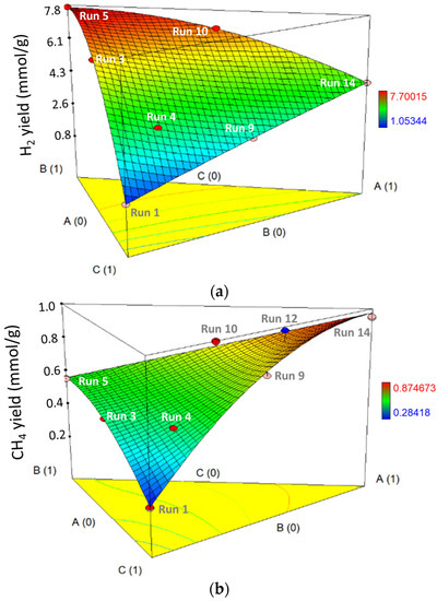 The p-values of model terms for each response are provided in Table 7. The H2 yields associated with AB (<0.0001), BC (<0.0001) and ABC (0.0002) were lower, indicating that these model terms significantly predict H2 yield. On the other hand, AC showed a borderline p-value of 0.0565. For CH4, the p-values associated with AC and BC were 0.0021 and 0.0433, respectively. Thus, these terms were used in the model. The ABC was considered despite its higher p-value. Since AB had a large p-value, it contributed significantly to predicting CH4 yields. To avoid introducing high variance (overfitting) into the model, the term AB was omitted. For CO2 yield, p-values for AB, AC, BC and ABC were lower than 0.05. Hence, all these polynomial terms were significant to include in our model. For TGY, p-values associated with AB and BC model terms were significantly lower than 0.05. For the AC term, the p-value (0.0543) was at the borderline of 0.05. However, further addition of the ABC term showed a p-value of 0.18. Hence, it was not included in the model equation.