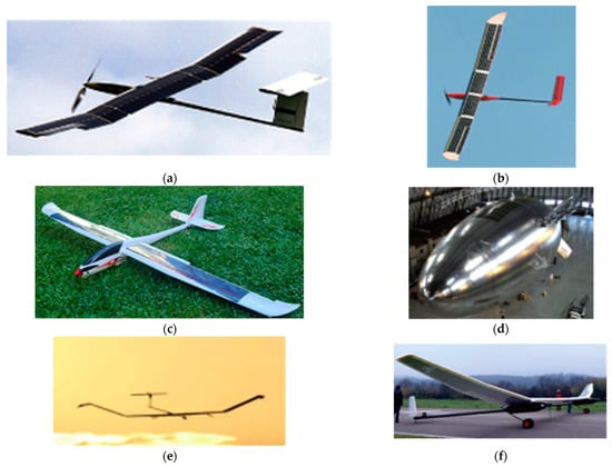 Different solar UAVs and aircraft. (a) Atlantik Solar from Zurich University; (b) Sky Solar from Zurich University; (c) Sun project from Hong Kong University; (d) Stratospheric airship, solar powered; (e) Zephir project from Airbus; (f) ELHASPA project from DLR; (g) Helios project from NASA; (h) Solar Impulse project.