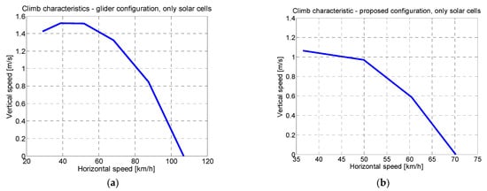 The electric motor is fed at its maximum power using energy from the solar cells and batteries simultaneously. In this case, it is important that the electrical motor operates at maximum power. The glider configuration has one motor with a maximum power of 350 W. The other two configurations have two motors of the same type, so the electric motors’ maximum power is 700 W. Considering electric motor efficiency and propeller efficiency, this provides 233 W propulsion power for the glider configuration and 465 W for the other two configurations.