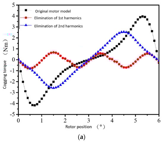 Figure 6c,d show the results of harmonic analysis of the cogging torque waveforms for the two motor models using the skewed slot design. It can be seen that the target harmonics in the cogging torque are significantly weakened by the layered skewed slot, without bringing about a significant increase in the amplitude of harmonics of other orders, and without introducing new harmonic components while reducing the harmonics of the specific order of the cogging torque.