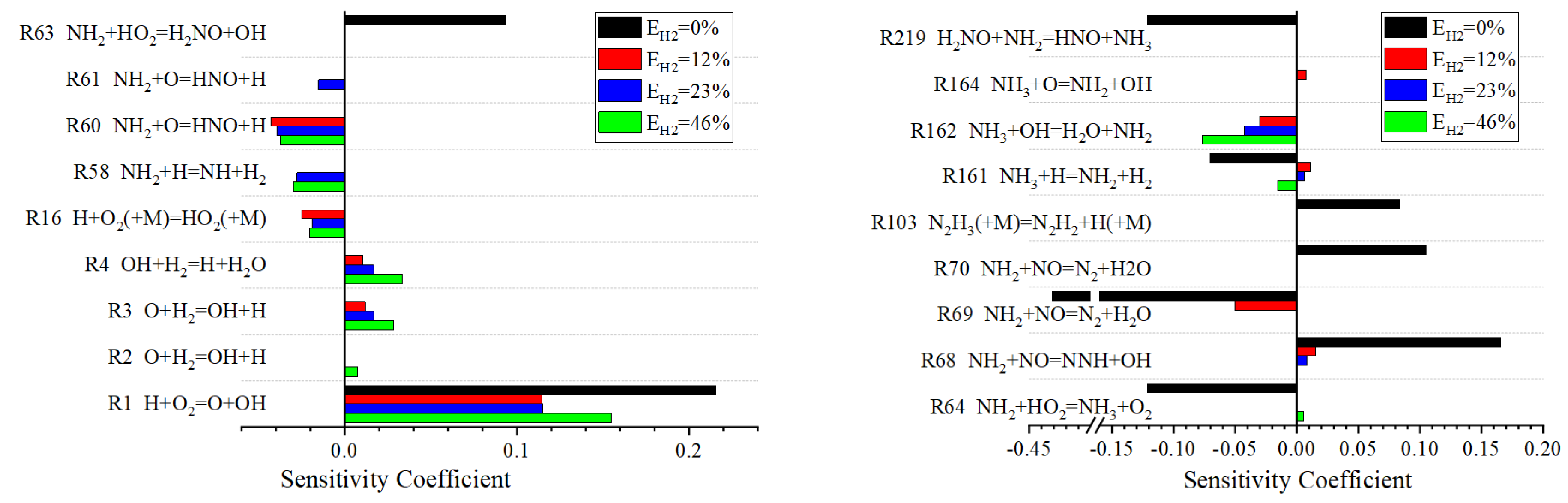 - With the increase of hydrogen blending ratio, the sensitivity of hydroxyl-related elementary reactions (e.g., R3: O + H2 = OH + H, R4: OH + H2 = H + H2O) increases. In the combustion of pure ammonia fuel, the reaction involving nitrogen oxygen and nitrogen hydrogen free radicals has a significant negative effect on the combustion delay period. The addition of hydrogen can inhibit the strong negative sensitive elementary reactions (R64: NH2 + HO2 = NH3 + O2, R69: NH2 + NO = N2 + H2O) in the ammonia combustion process, and can significantly shorten the ignition delay. Under the same ignition timing, with the increase of hydrogen blending ratio, the peak value of cylinder pressure and heat release rate increases, as does the corresponding peak value of the crankshaft. Angle advances and the ignition delay period and combustion duration become shorter.