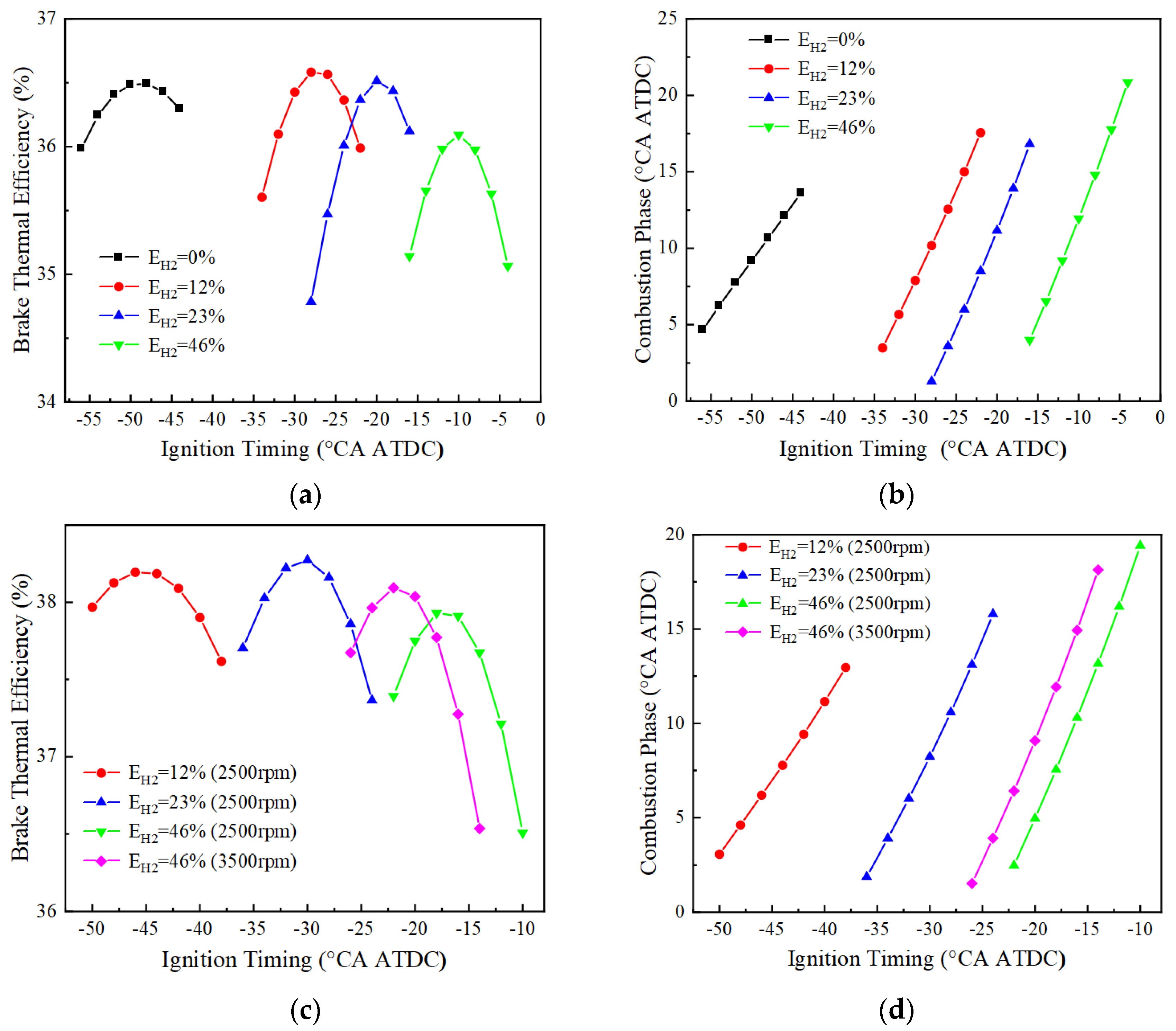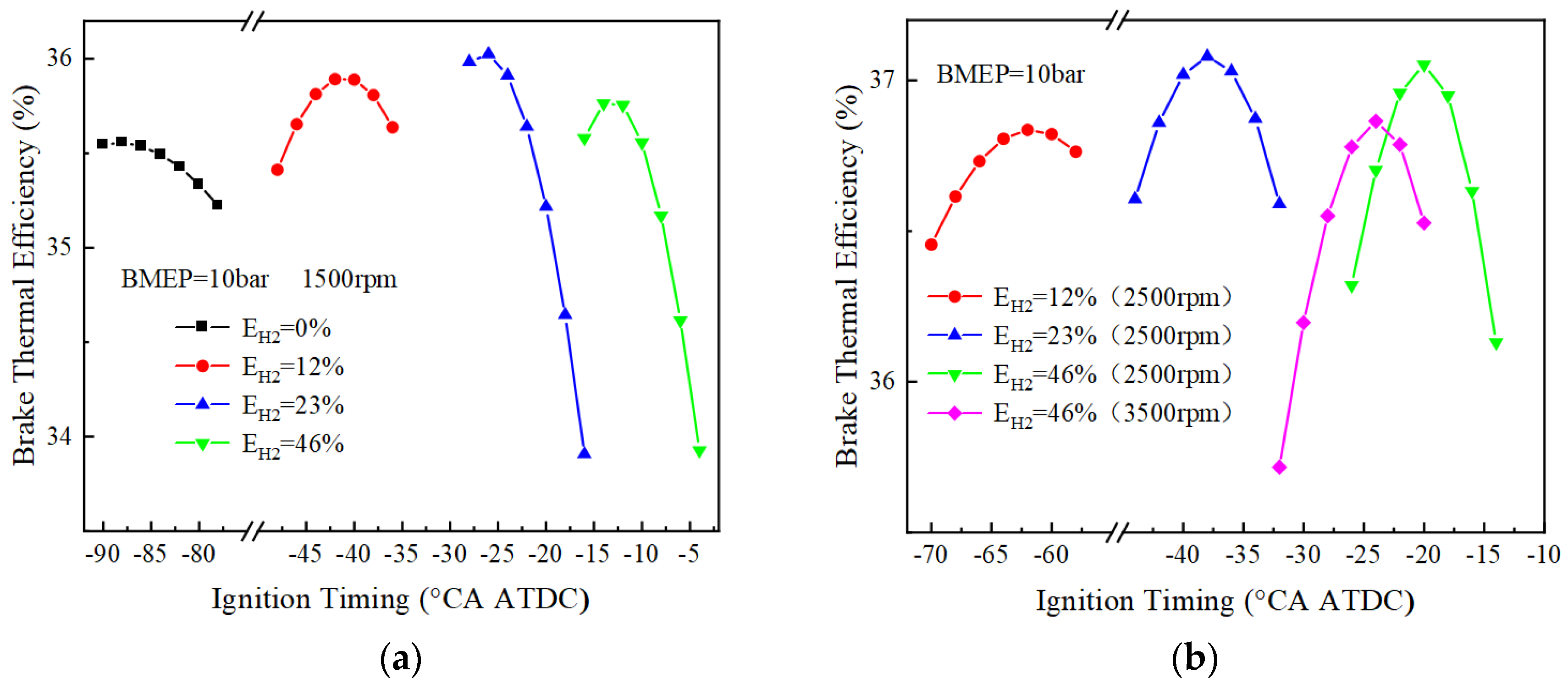 - Ammonia fuel, due to its low reactivity, requires a large ignition advance for successful ignition at 1500 rpm and does not ignite reliably at medium to high engine speeds. The fuel with 12% hydrogen blending has a high BTE of up to 36.6% at low speeds. As the engine speed increases, the ignition difficulty of the pure ammonia and low hydrogen blending ratio increases, and it is necessary to increase the hydrogen blending ratio to ensure reliable ignition.