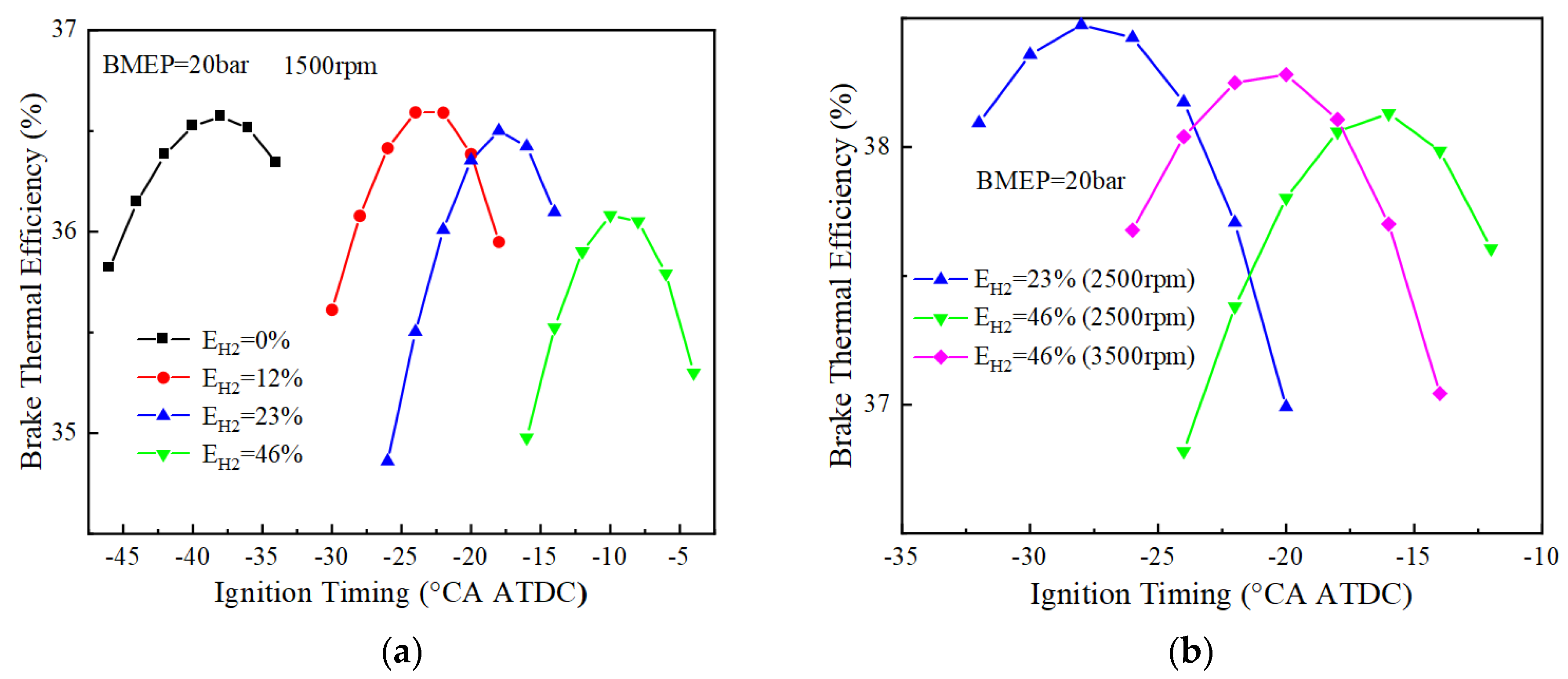 - The BTE of the blended fuel with a 23% hydrogen blending ratio at 2500 r/min has the highest BTE at BMEP = 10, 15, and 20 bar, with optimum thermal efficiencies of 37.1%, 38.5% and 38.3%, respectively. When the hydrogen blending ratio reaches 46%, BTE presents a small reduction. The possible reason is the high ratio of hydrogen blending produces large heat transfer losses due to rapid combustion. Under the speed of 3500 rpm, normal ignition can be ensured only when the hydrogen blending ratio reaches 46%. With the increase of the engine speed, it is necessary to appropriately increase the hydrogen blending ratio in order to obtain a higher BTE.