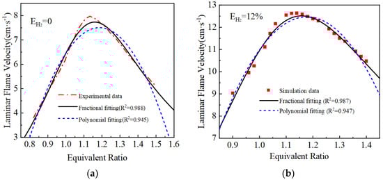 Fitting results of laminar flame velocity under different hydrogen blending ratios: (a) EH2 = 0%; (b) EH2 = 12%; (c) EH2 = 23%; (d) EH2 = 46%.