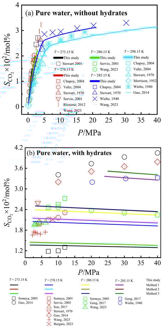 Understanding the phase equilibrium conditions of CO2–pure water/NaCl aqueous solution–CO2 hydrate is a prerequisite for calculating CO2 solubility. In the meantime, based on the CO2 solubility data, the phase equilibrium conditions of CO2–pure water/NaCl aqueous solution–CO2 hydrate can also be predicted. Limited experimental studies have been conducted on CO2 solubility and phase equilibrium conditions of CO2–pure water/NaCl aqueous solution mixtures within the temperature and pressure range of 273.15~298.15 K and 0.1~40 MPa due to the involved extreme environments such as high pressure. The relevant studies we can obtain include: studies on the phase equilibrium conditions of CO2–pure water [11,16,17,18,19,20,21,22,23,24,25,26,27,28,29,30,31,32,33,34,35]/NaCl aqueous solution [11,20,30,31,32,34,35,36,37,38,39,40,41,42,43,44]-CO2 hydrate, studies on CO2 solubility in pure water [11,45,46,47,48,49,50,51,52,53] and NaCl aqueous solution [54] in systems without hydrates, as well as studies on CO2 solubility in pure water [11,12,36,47,48,50,52,53,55,56,57,58,59,60,61] and NaCl aqueous solution [11,36,57,62] in systems with hydrates.
