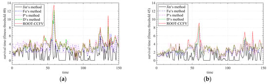 From the above analysis, it can be seen that for the dynamic optimization problem with time-varying parameters shown in (21), ROOT has good engineering application value because it can find the robust solutions of the time-varying elements of the WT and PV in the time domain of the dynamic optimization problem. Therefore, ROOT was introduced to solve the problem. However, most ROOT algorithms need to use future predicted fitness values to find solutions with better robustness. However, the existing methods ignore the influence of prediction error on the robustness of the solution, and the prediction error is large, so it is difficult to find a better robust solution. In order to reduce the influence of prediction error on the robustness of the solution, this paper makes full use of the change trend of the fitness value of the solution in the historical moment and the future moment and guides the algorithm to select the better solution of survival time (ST) and average fitness (AF) [] in the solution space. At the same time, by analyzing the characteristic quantity of the change in the fitness value of the solution, the limitation of the prediction error on the robustness optimization is reduced.