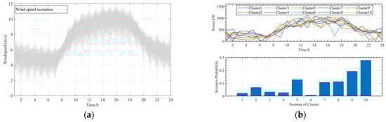 The scene analysis method mainly includes two parts: scene generation and scene reduction. Scene generation refers to the large-scale scenarios with uncertain characteristics obtained by sampling according to the PDF or statistical characteristics of the research object, which can be represented by the set . In this paper, LHS was used as a method for scene generation. Scene reduction reduces the number of similar scenes by analyzing the data set of set , obtains the expected number of scenes, and reduces computational complexity. In this paper, BR was used as a method for scene reduction. The set , composed of a small number of classical scenes, was obtained by BR, which can represent the random variables of the original scene to a large extent. The process is shown in Figure 4.