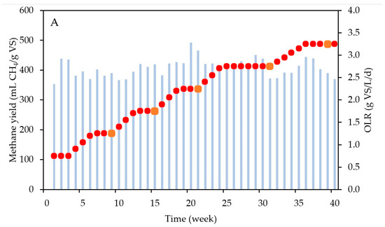 Figure 4B shows a consistent upward trend in the VS concentrations with increasing OLRs. With a constant HRT in the present experiments, the increase in OLR leads to higher substrate VS concentrations entering the digester. As the methane yields were constant, it can be hypothesized that the substrate was equally converted into biomass at any OLR value, implying that higher VS concentrations represent an increase in active biomass concentrations [39]. Given that FW is a highly biodegradable substrate (VS/TS of 94.2%, with TS being total solids), the increase of non-biodegradable organic matter was negligible. To validate this hypothesis, quantitative polymerase chain reaction (qPCR) was performed. However, the differences in biomass concentrations (log-based) at increasing OLRs were too small to allow us to observe significant differences (Figure S1).