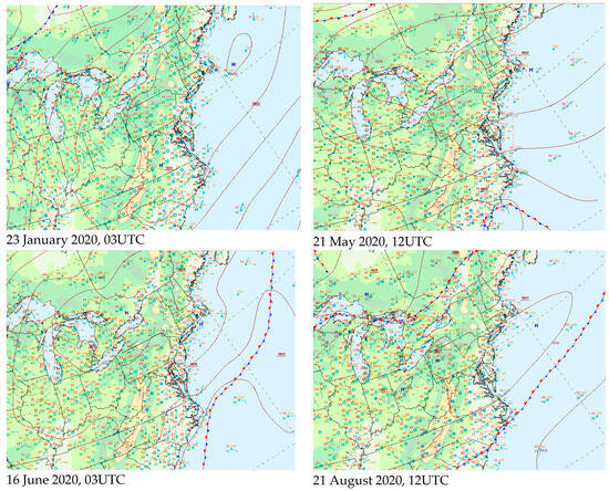 Surface analysis maps from NOAA’s Weather Prediction Center (https://www.wpc.ncep.noaa.gov/, accessed on 6 June 2023). The contour lines are isobars of mean sea level pressure (mbar).
