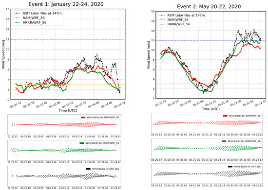 The time series plots highlighted that both model configurations for the six different anticyclonic events captured the temporal evolution of wind speed at the hub height quite well (Figure 5). Both model configurations struggled to capture the November event, which exhibited a steady upward trend of wind speed, though the NAM/WRF reached the peak at the very end of the simulation. Also, there was a sudden and frequent shift in wind direction, which prevailed from the northwest, but as wind speed dropped, the wind direction changed to become southward, ultimately settling into a southwesterly direction over time. Neither model could capture the clear westerly wind seen in the observations. In the month of January, initially, the predominant wind direction was from northwesterly to westerly, which gradually shifted to southwest because of the high-pressure system’s movement. Toward the end of the event, the wind direction reverted to northwest due to the influence of another high-pressure system developing further inland on the west. Both model configurations struggled to predict the first shift in the wind direction, but the HRRR/WRF managed to obtain the second one. In the May event, the wind was initially northeast and then shifted to a south–southeasterly direction due to the influence of the transition of high pressure. The models captured the transition very well. Like the May event, wind during the October event was initially coming from the northeast and transitioned between easterly to south-easterly and the HRRR/WRF performed better to capture the transition. In June, a northeast wind was predominant, which the models represented accurately. Finally, during the August event, winds were predominantly south–southwesterly, briefly shifting to northwesterly at the end of the event. Particularly, during the drop in the wind speed, the HRRR/WRF tended to portray the change in the wind direction closer to the observations.