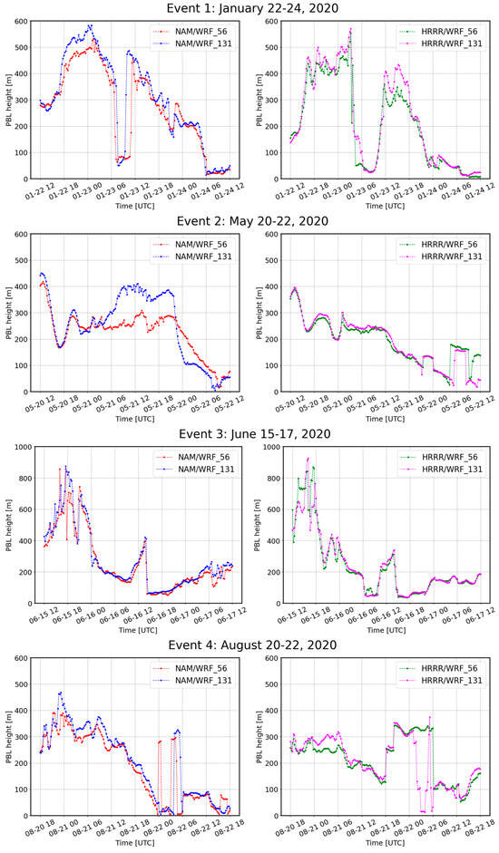 Time series of PBL height from the 600 m domain for the NAM/WRF and HRRR/WRF and two sets of vertical levels (56 and 131) at the ASIT lidar buoy location.