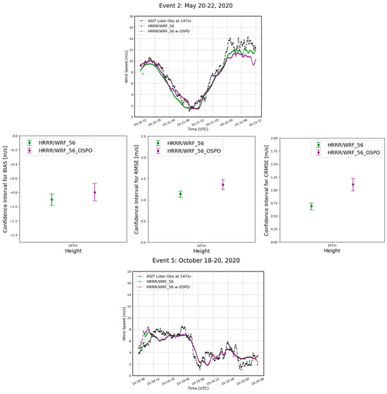 Time series of wind speed at the wind turbine hub height from the HRRR/WRF simulations and bootstrapping confidence intervals for mean bias, RMSE, and CRMSE for the May, October, and November anticyclones. We tested the HRRR initializations with 56 vertical levels and with/without the high-resolution SST input (OSPO 5 km).