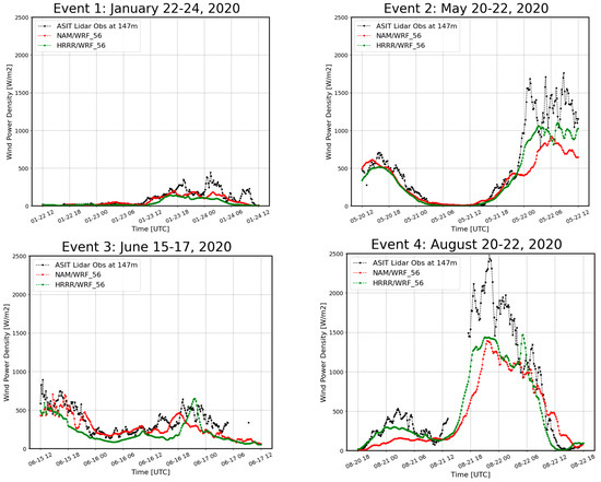 From the previous sections, the conclusion was that the initial and boundary conditions exhibited the largest influence on the hub height WRF wind prediction. The NAM/WRF and HRRR/WRF configurations were able to capture low wind speed occurrences during the presence and movement of anticyclones, providing confidence that the model is capable of reliably predicting such wind drought occurrences. Even though we selected similar types of weather patterns over the Northeast U.S. (anticyclones with low wind), there was no single configuration that performed best for all cases. Naturally, the next question was whether a similar significance would apply to the prediction of offshore wind power density, given that wind power is based on cubic wind speed.