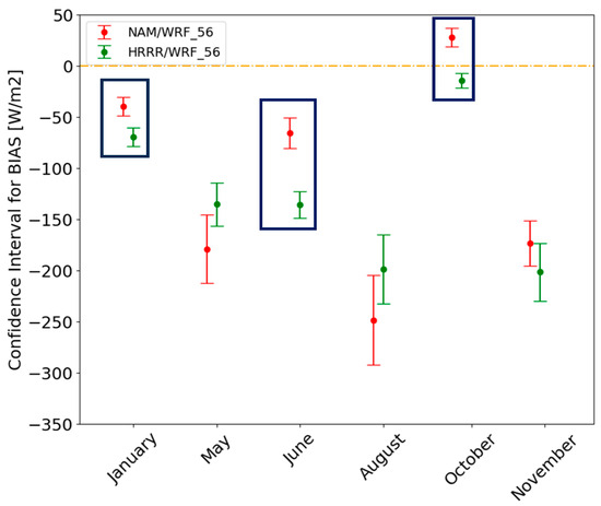 Bootstrapping confidence intervals for mean bias, RMSE, and CRMSE of WPD (W/m2). The orange line designates the zero-bias line, and the blue square denotes statistically better error metrics.