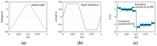 In order to verify the track performance of ACBE, this paper takes fuzzy control (FZC) as a comparative object. The given angle and palstance input of reciprocating motion are shown in Figure 11a and Figure 11b, respectively; the angle is from −8° to +8°, f = 1 Hz, and palstance is 0.698 rad/s at uniform motion. Under the given input, Figure 11c shows the current of the swing coil with ACBE and FZC; Iu is the current at uniform motion, which is around 1 A. The magnitude and fluctuation of the armature current can affect the accuracy of the control parameters of ACBE and vice versa. The control parameters of ACBE have higher accuracy when Iu = 1 A and f = 1 Hz, which make its current fluctuations lower than those of FZC. The varying torque (acceleration) will increase the amplitude of the armature current, which is not beneficial to the tracking performance of ACBE.