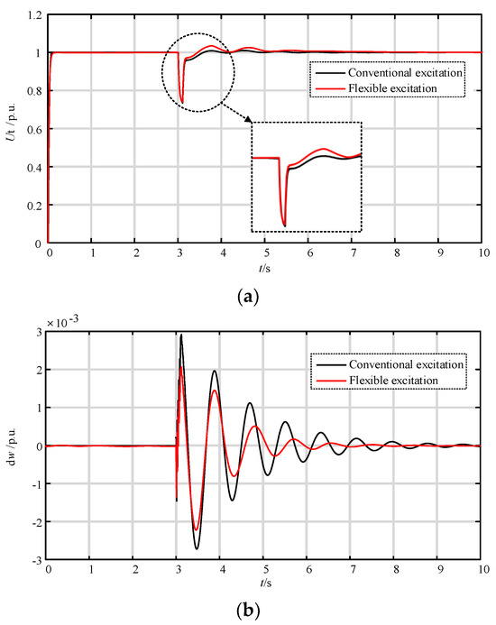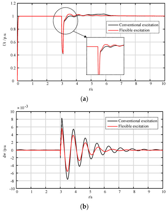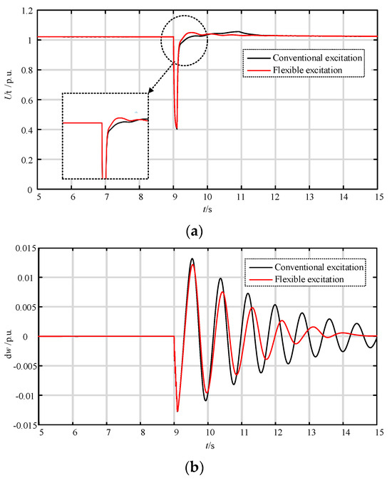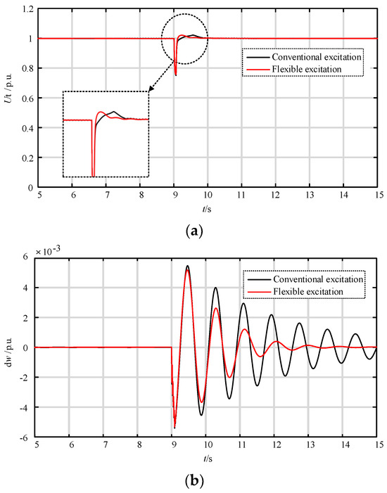 Under generating conditions, a single-phase grounding fault occurs on the high-voltage side of the main transformer, which occurs for 3 s and disappears after 0.1 s. Figure 11 shows the deviation curves of the terminal voltage and rotor speed before and after a short circuit occurs under generating conditions. When the fault occurs, the terminal voltage drops and the power angle begins to oscillate. After the fault disappears, the terminal voltage begins to recover, indicating that the recovery speed of flexible excitation is significantly faster than that of conventional excitation, which can effectively improve the transient stability of the system. From the perspective of power angle oscillation, the oscillation amplitude of flexible excitation is smaller and the convergence speed is also faster. During the fault and recovery period, the flexible excitation system fully utilizes the reactive power exchange capability differently from the conventional excitation system. It can improve the voltage support and oscillation suppression capabilities of the unit by exchanging reactive power with the generator terminal, while the conventional excitation system does not have the ability to exchange reactive power with the generator.