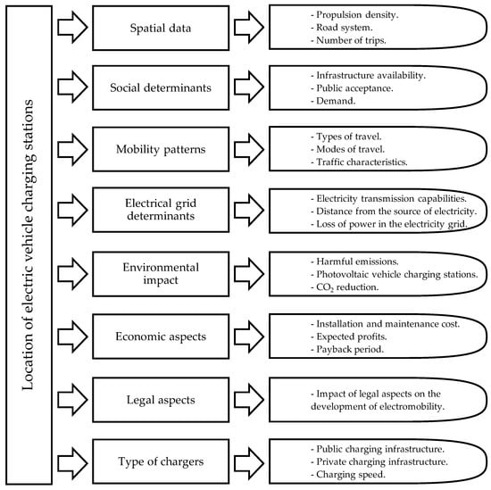 One of the main challenges of electromobility development in urban areas is the identification of criteria that are required to assess the potential of a given location for an EVCS and to select the best places for building EV charging infrastructure. Figure 1 presents a set of criteria related to the issue of determining the locations of EVCSs, which is the basis of the literature review.