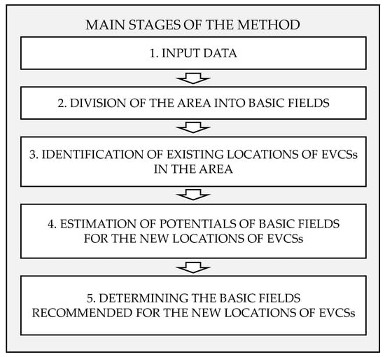 The present article is divided into five parts. The purpose of the developed method and the structure of this article are presented in the Introduction (Section 1) against the general background of the issues analyzed. Section 2 presents a review of the literature on selected areas related to locations for EVCSs, including social, spatial, economic, legal, technical, and environmental aspects. Section 3 presents the general assumptions and a description of the method for determining the locations for EVCSs in urban areas. Section 4 contains the results of the research carried out using the proposed method for the medium-sized city of Gliwice in Poland. The final sections (Section 5 and Section 6) include a discussion of the results, directions for further research, and conclusions. Appendix A contains the notation, a formal description of the method, and its algorithm.