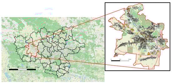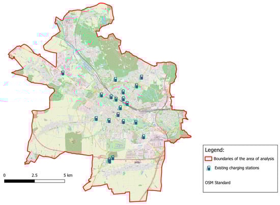 The purpose of the method is to support decisions on the selection of new locations for EVCSs, taking into account the characteristics of the spatial development of the area under study. Publicly available data collected from the BDOT10k database were used. This object-oriented database contains the spatial location of topographic objects along with their characteristics. The content and details of the BDOT10k database correspond to a topographic map at a scale of 1:10,000. The method used GIS tools, which are increasingly used in transport decision-making problems, for example, for forecasting transport demand [], assessing the accessibility of public transport [,,], assessing the spatial integration of bike-sharing stations [], and even for conducting analyses of innovative solutions introduced in the future [] and risk analyses [].
