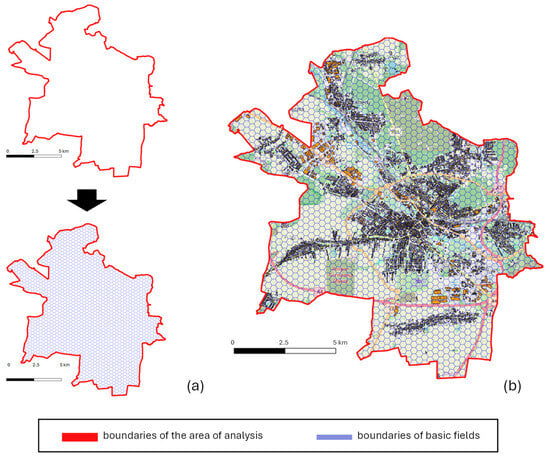 In the stage when input data are entered (stage 1), it is required to determine the spatial boundaries of the area, select the method of dividing the space (i.e., the shape and size of the basic fields), and specify the number of new locations for EVCSs. The size of the basic field depends primarily on the availability of spatial data that enable the identification of development facilities in a single field and acceptable access (mainly walking time) to an EVCS by potential users of these facilities. Hexagonal shapes of the basic fields were adopted for the analysis.