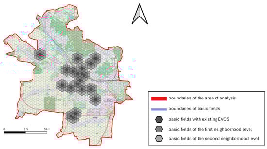 The recommended locations for EVCSs are determined based on the potentials of the basic fields for new locations for EVCSs. As a consequence of the assumptions adopted, the locations for EVCSs are determined with hexagonal accuracy, which means that the method indicates a set of hexagons in which new locations for EVCSs are recommended. In our method, we assume that ensuring equal access to the electric vehicle charging infrastructure will contribute to the greatest possible coverage of this area, with EVCSs and increase the accessibility of such facilities, which may have a positive impact on the decision-making process regarding the ownership of EVs by residents of a given area and people using its facilities [].