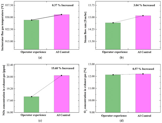 Experiments confirmed that the automatic control of the studied ICC system resulted in a 2.41% increase in steam flow rate and a 7.33% reduction in NOx emissions. In January 2024, a four-day experiment was conducted to evaluate the automatic control of the ICC system under the same conditions as the performance evaluation of AI combustion control. To address the issue of increased NOx emissions observed in previous experiments, the AI was updated to suggest the operating method at 5 min intervals, and the second FD and ID fans were automatically controlled to gradually transition from the current airflow rate to the AI-suggested airflow. The results, shown in Figure 9, indicate that the incinerator flue gas temperature decreased by 0.66%, steam flow rate increased by 2.41%, power generation increased by 3.09%, and CO emission concentration decreased by 60.72%. Additionally, unlike in the performance evaluation of AI combustion control, NOx emissions decreased by 7.33%. These results are similar to those found in previous studies conducted by incinerator manufacturers [19,20,21,22,23,24,25].