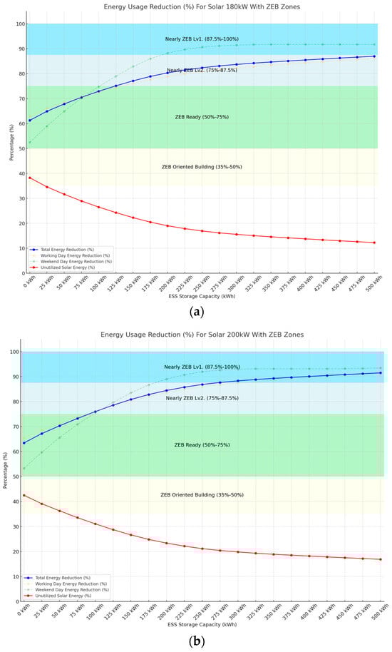 - 180 kW Solar PV System: The energy usage reduction shows improvement compared to the 160kW system, advancing further into the ZEB Ready zone. However, it still falls short of achieving the Nearly ZEB Level 1 zone (87.5–100%), indicating that while performance has improved, additional enhancements in either ESS capacity or PV system size are required to reach the highest energy efficiency levels. Unutilized solar energy decreases faster as ESS capacity increases, indicating better alignment between generation and storage.
