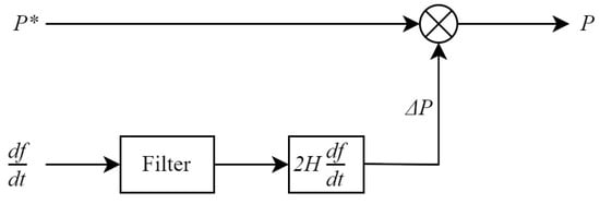 The energy delivered in the form of inertia may come from various sources such as the DC link capacitor [], from the kinetic energy stored in the rolling masses of the turbines [] or from both elements []. Figure 1 depicts the simplified inertia control loop for calculating  and performing frequency regulation using the VSC-HVDC link [].
