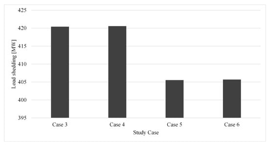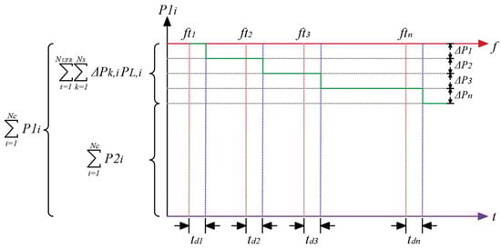 where  corresponds to the value of active power demanded by the i-th load of the system before a fault occurs;  corresponds to the value of active power demanded by the i-th load of the system after the frequency event and the corresponding operation of the UFLS scheme. Meanwhile,  represents the set of system loads, as shown in Figure 2.