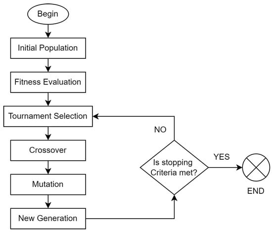 A GA implemented in Python was used to solve the model described by Equations (6)–(16). GAs are metaheuristics that mimic the Darwinian evolutionary process, wherein the fittest individuals are more likely to transmit their traits to the next generation. GAs have been applied successfully to a variety of problems such as vulnerability assessment [,], protection coordination [,], expansion planning [,], etc. Furthermore, it has been demonstrated that GAs are effective in addressing the problem of UFLS scheme dimensioning, as indicated in [,,]. Figure 3 illustrates the flowchart of the implemented GA [].