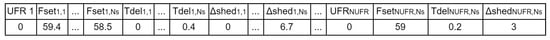 The UFLS scheme is formulated as a mathematical optimization problem that aims to minimize the amount of shed load during a frequency event by obtaining the optimal parameters for each of the relays that constitute it. In this case, the minimization of load shedding was used as the objective function by considering: (1) the percentage of load to be shed at each stage, (2) the activation threshold for each stage, (3) the intentional time delay between each of the stages and (4) the placement of each of the relays, i.e., whether a relay is activated or not or if it is considered within the scheme design. If these parameters of the UFRs are considered to solve the optimization problem, the vector of control variables  can be represented using Equations (9) and (10):