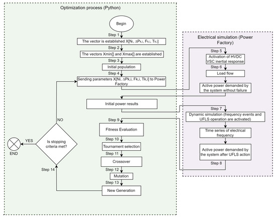 The implementation of the GA was carried out through the co-simulation of two subsystems: one focused on obtaining the frequency response of the power system using DigSILENT PowerFactory and the other dedicated to iteratively solving the numerical optimization problem using Python. An illustration of such configuration is presented in Figure 5, prominently demonstrating the division between the processes carried out in the optimization software and the power systems software. The stages included in the flowchart summarizing the proposed methodology are, in descending order: