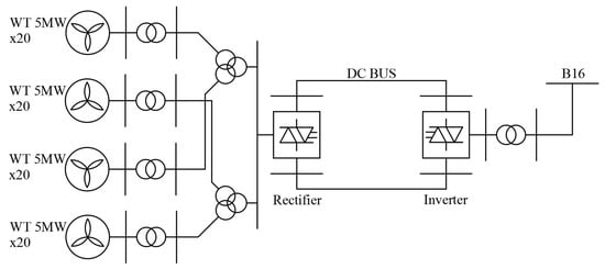 This section presents the results of applying the proposed methodology to a case study using the DigSILENT PowerFactory and Python tools. Simulations are conducted on the IEEE 39-bus test system, incorporating a VSC-HVDC link with its respective control schemes for normal operation and the provision of synthetic inertia. A wind farm is connected to the test system using the highlighted blue VSC-HVDC link in Figure 6. In this system, loads are represented as constant power injections. Several authors have proposed different connection buses of HVDC links in the IEEE 39-bus test system. In [], an HVDC link is connected to the system on bus 18, replacing the thermal generators on buses 30 and 32. In [], a multi-terminal HVDC (HVDC MTDC) link is connected between nodes 4, 16 and 17; whereas in [], it is connected to buses 16, 21, 22, 23 and 24. Also, in [], buses 16 and 26 are used for the connection of an HVDC MTDC link. In this work, the HVDC link is connected to bus 16 since it is common in the connection of several HVDC links and because this bus is usually considered as the connection point when the system is divided in two [] or three areas [].