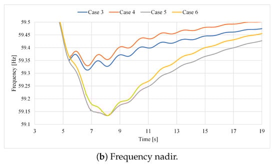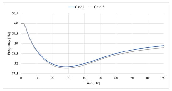 In the context of the increasing integration of renewable energy sources interfaced with grid-connected inverters and the evolution toward more decentralized and flexible power systems, grid security and stability have become crucial challenges [,]. Frequency deviations are among the most critical threats in power systems. Frequency may experience significant deviations due to events such as generator tripping or the variability of intermittent renewable generation []. Since the frequency is essentially the speed of the power system, it can be understood as an indicator of the balance between generation and demand [], which increases when generation is greater than demand (accelerated system) and decreases when demand exceeds generation (decelerated system) [].