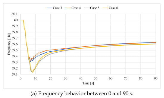 In an electrical system, the frequency reflects the balance between generation and load by showing how the system accelerates or decelerates when faced with imbalances of these two variables. Thus, in the event of a large active power imbalance, caused, for example, by the loss of a generation unit, the frequency should decrease since the system would be overloaded, with loads predominating over generation. When a frequency unbalance occurs, it is usually taken care of instantaneously by the natural inertia of the system, i.e., by releasing or absorbing energy in the rolling masses of the rotating machines. Generator controllers inject more power from reserves. The Automatic Generator Control (AGC) is activated and, finally, the tertiary control is activated [].