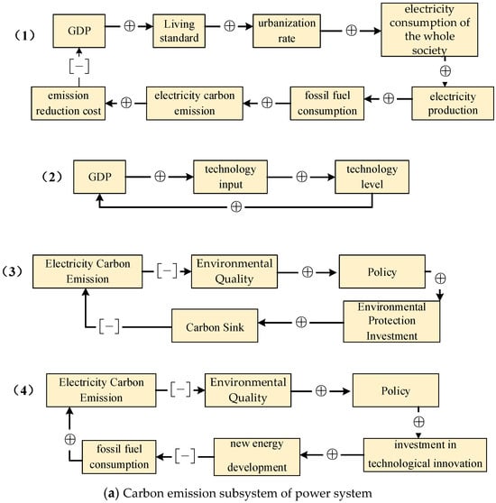 The electricity carbon emission system is a relational complex system and is influenced by various elements within the system. The system can be divided into macro-environments, such as the economy and population, and sub-environments, such as the share of thermal power and coal consumption for power generation and other power sector-specific environmental parameters. The causal relationship between the main influencing parameters is shown in Figure 2. A”“ indicates a positive correlation effect on the parameter, and a “ [−]” indicates a negative correlation effect on the parameter.