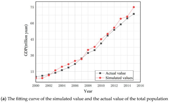 In this paper, the schematic diagram of the flow stock of the system in Figure 3 and the relevant model formulas are used to simulate GDP, total population, and electricity carbon emissions, and the validity of the model simulation results is tested by the method of historical verification. The simulation time of the system is set to 2000~2019, and some initial values of the starting time are in 2000. The model training period is selected from 2000~2015. The results of the training adjustment are shown in Figure 4.