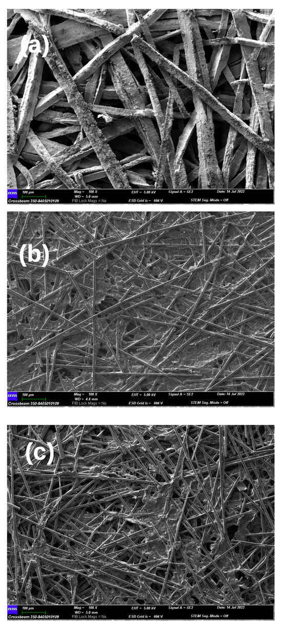 Figure 2 shows the SEM images of the three GDLs studied in this work. Thus, Figure 2 shows the different morphology existing between GDL-Ti and the two GDLs fabricated using natural fibers. From the images of Figure 2, we see the evident different morphology existing between the GDL-Ti and the other two GDLs.