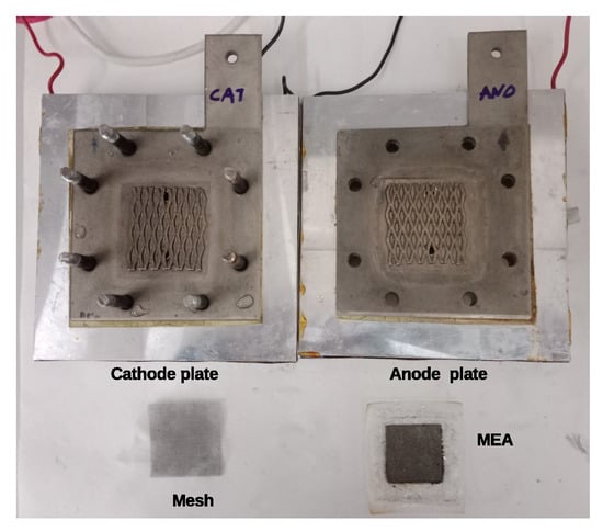 A single-cell electrolyzer was studied. In this regard, Figure 3 shows the elements that compose the single cell. In this regard, both plates and the big mesh were of titanium. An additional stainless mesh was added to the cathode side to improve the electric contact with the GDL. Finally, an image of the MEA prepared following the above procedure was included in Figure 3.