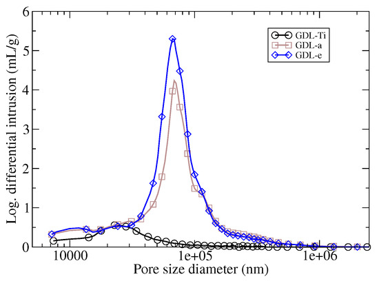 GDLs play a crucial role regulating the flux of water and gases from and to the catalyst face in a PEMWE. In this regard, the pore diameter and pore distribution function are going to affect the flux of water and gases by the dimensions of the pore diameters. Thus, the response of the electrolyzer is going to be modulated by the pore distribution in the electrolyzer. In this context, Figure 4 shows the pore distribution functions of the three different GDLs studied in this work.