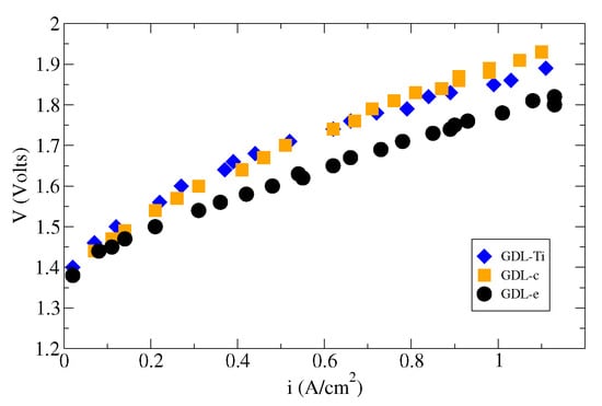 Thus, from Figure 6, we see how the electrolyzer containing a GDL-Ti shows similar performance to the electrolyzer with a GDL-c, in spite of the excellent electrical conductivity and permeability of the GDL-Ti. This difference is even more notable when the performance of the electrolyzer with a GDL-Ti is compared with the corresponding GDL-e.