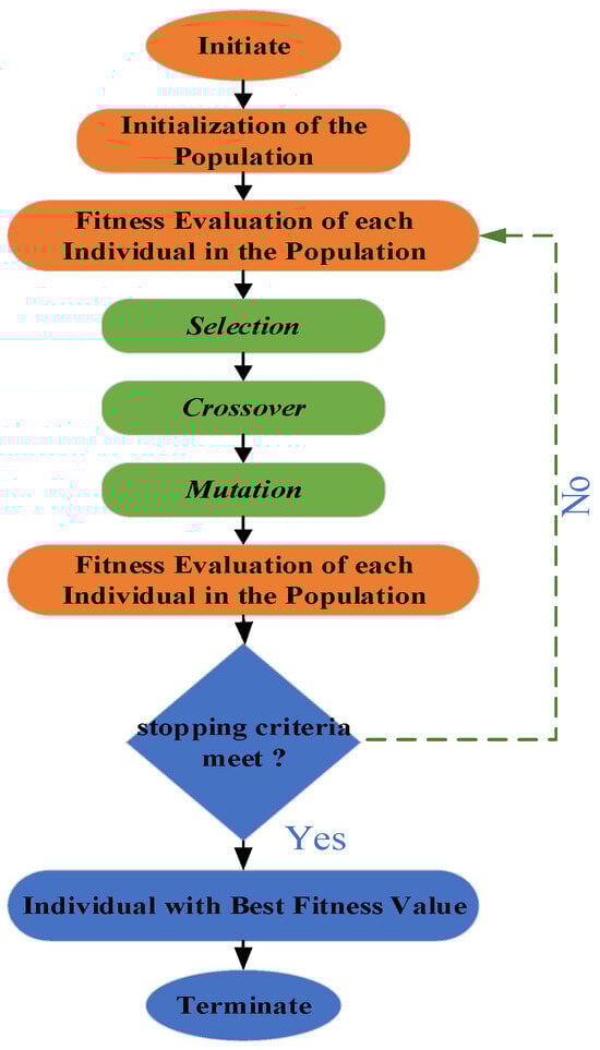 Genetics and evolution provide the theoretical foundation for the GA, which scientist John Holland first created in 1975 []. The highly effective encoding method of the GA allows a solution vector to be represented as either a binary string or a real-coded string. Both encodings have different purposes in different problem domains. The GA is regarded as a global optimizer that can often identify a potential region, locate it, or even correctly obtain the optimum solution, which is also known as the global minimum [,]. The three operators that support this widely used method’s ability to function well in optimization jobs are as follows: