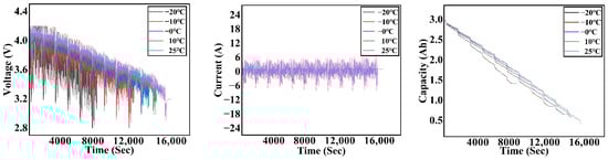 The model’s performance was evaluated using test data from the LA92 drive cycle conducted at six temperatures, −20 °C, −10 °C, 0 °C, 10 °C, and 25 °C, covering a broad spectrum of both low and moderate temperatures to ensure robustness across varying thermal conditions. Figure 3 presents the characteristic curves of the LG 18650HG2 Li-ion cell under UDDS cycle conditions.
