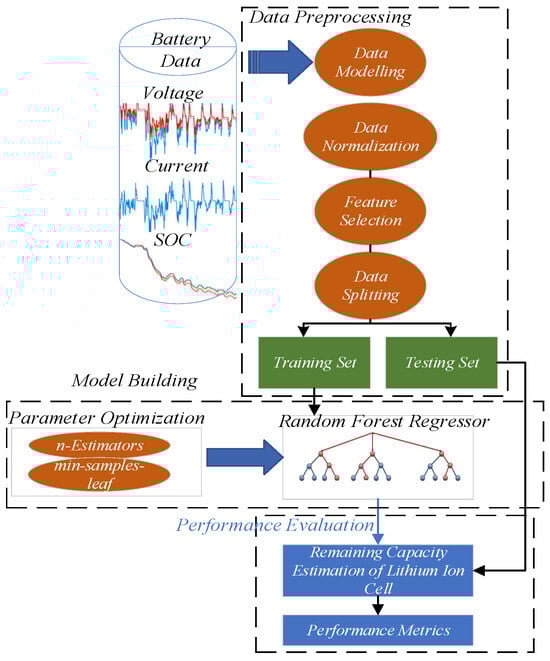 RF (Figure 1)is a general purpose machine learning technique that is frequently used for regression and classification applications. In this study, the remarkable regression capability of the RF model is utilized to precisely estimate the SOC of batteries used in electric vehicles. Leo Breiman first presented RF in 2001 []. An advanced form of the decision tree is the random forest []. A different subset of the training data is used to train each decision tree, and the outputs of all the trees are combined to get the final predictions. By training each decision tree on a random subset of the training data with replacement, RF uses the bagging method. This tactic improves model generalization and successfully lowers overfitting []. Due to its many benefits, RF is a good choice for the current SOC estimation assignment. It performs well with big, high-dimensional datasets, manages noisy data, and shows resilience to missing values and outliers. The number of trees in the forest is one of the key RF hyperparameters that greatly affect model performance. Hyperparameter adjustment was performed for the SOC estimation task to determine the optimal arrangement. The equations below form the core of RF regression and its training process.