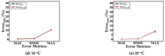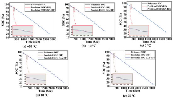 In this section, the proposed GA-RF model is compared with the RF. In this experiment, the proposed GA-RF model is compared with the basic RF model without tuning implemented in this work. The experiments are performed at temperatures of −20 °C, −10 °C, 0 °C, 10 °C, and 25 °C. The drive cycle used for the experimentation of both the RF and GA-RF is the UDDS, known as a dynamic drive cycle. Table 5 shows the SOC-estimated results of both the RF and GA-RF models. As the temperature increases, the estimation results improve, and the GA-RF model shows improved results compared to the traditional RF model. The MAE and RMSE of the GA-RF improved compared to the RF algorithm by 41.37% and 24.92%, respectively, at −20 °C, 46.28% and 29.07%, respectively, at −10 °C, 50% and 31.01%, respectively, at 0 °C, 45.90% and 29.09% at 10 °C, and 31.87% and 18.57%, respectively, at 25 °C. Whereas the MAX error improves for −10 °C and 10 °C by 0.75% and 4.95%, respectively the MAX error increases for temperatures other than −10 °C and 10 °C.