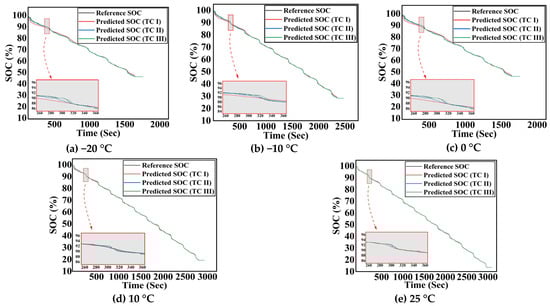 SOC estimation curve comparing reference SOC and estimated SOC values under varying ambient temperatures at varying input feature conditions.