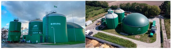 Agricultural biogas plants are distributed energy sources (with relatively low power) that may represent a new development direction in rural areas. Due to the limitation of areas intended for cultivation and problems related to waste management, agricultural waste is becoming an important raw material for the production of biofuels []. Unlike wind farms and photovoltaic systems, bio-substrate fermentation is one of the few ways to produce energy in a sustainable and controlled way []. Biogas generation may therefore be a promising alternative to other techniques for recovering energy from biomass [,].