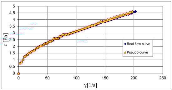 The value of the flow rate was determined using Formula (2) for the entire range of the analyzed deformation gradient, and then, using Formula (3), the values of the actual deformation gradient were determined, which made it possible to determine the real flow curve. Next, using the iteration process and the least squares method, the values of the rheological parameters of selected rheological models were determined by searching for the minimum of the residual sum of the squared deviations. Figure 2 shows the result of calculations for one curve for the test medium at 30 °C.